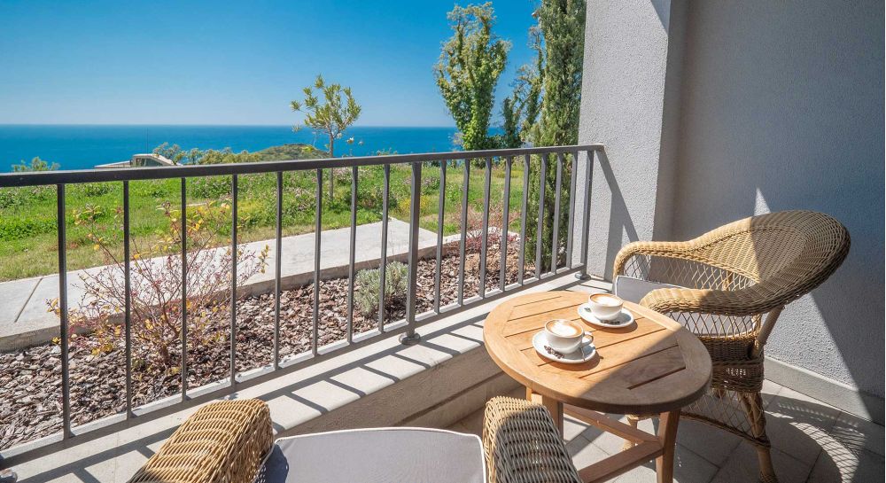 Extended balcony with a table setting for two